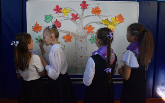 Затем участники фестиваля, школьники 2-4 классов, с искренним задором исполнили флешмоб под гимн «Орлята России». В ходе мероприятия ведущие праздника предложили ребятам создать свое «дерево счастья». Мальчишки и девчонки с удовольствием приклеивали разноцветные листочки со своим пониманием слова «Счастье».