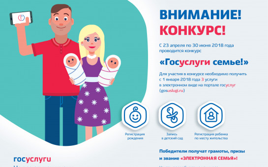 Департамент информатизации и развития телекоммуникационных технологий Новосибирской области (далее – департамент) с 23 апреля по 30 июня 2018 года организует проведение на территории города Новосибирска и Новосибирской области конкурса «Госуслуги семье!» среди граждан, заказавших комплекс услуг в электронном виде: регистрация рождения ребенка, запись в детский сад, регистрация ребенка по месту жительства (пребывания).